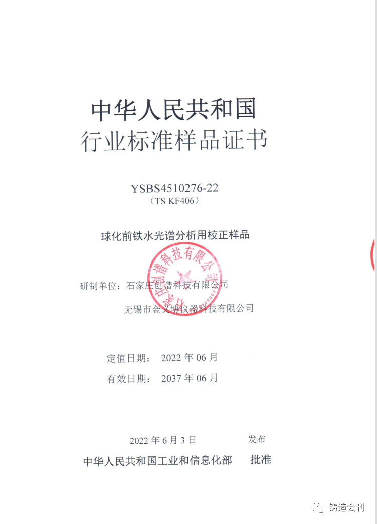 祝賀無錫市金義博儀器科技有限公司獲得《球墨鑄鐵原鐵水標準樣品》行業標準制定的證書