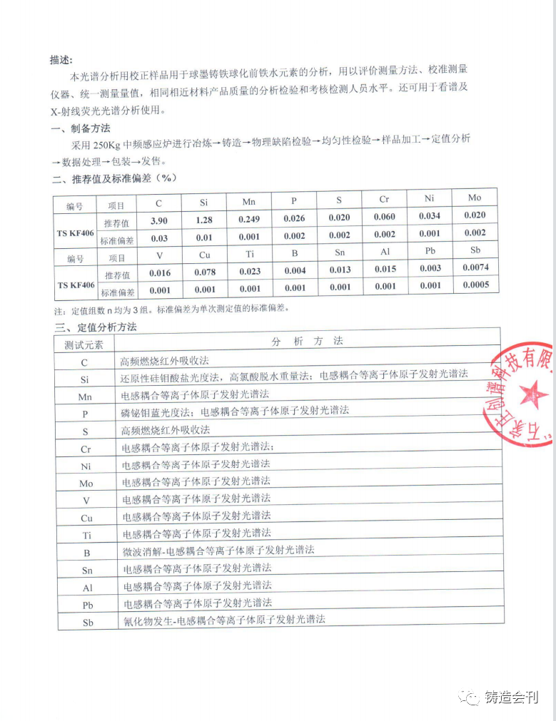 針對市場的要求,無錫市金義博儀器科技有限公司結合鑄造企業的實際成分要求,與石家莊創譜科技有限公司聯合開發了球墨鑄鐵原鐵水標準樣品,該樣品完美的解決碳元素分析準確性的問題,同時對于硅、錳、磷、硫做了很好地控制,特別突出了一些微量元素(CrBSnSbPbAlTi)的控制。對于鑄造企業對原鐵水的成分控制起到至關重要的作用。